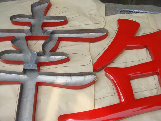 鐵皮烤漆字 鐵皮烤漆字可以根據(jù)字面意思分為兩部分進(jìn)行理解,第一部分是鐵皮,第二部分是烤漆。鐵皮烤漆由于顏色多變,可以根據(jù)客戶的要求制作不同的顏色而受到廣大消費(fèi)者的喜愛??梢允羌で檠笠绲募t色,可以是明亮的黃色等。 鐵皮烤漆發(fā)光字工藝和不銹鋼發(fā)光字工藝大體相差不多。都是要用機(jī)械進(jìn)行加工。